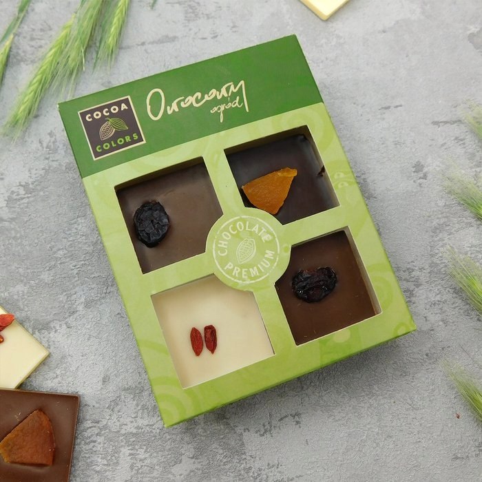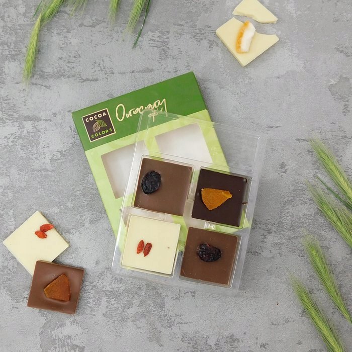 To pyszna i kolorowa kombinacja, idealna dla miłośników słodyczy i owocowych aromatów. Trzy rodzaje czekolady oferują bogactwo smaków, a kandyzowane owoce nadają każdej czekoladce niepowtarzalny smak i teksturę.