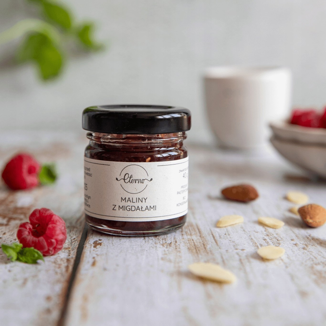 Składniki: maliny 67%, cukier, migdały 3% (spoza Polski). Sporządzono z 67g owoców na 100g produktu.